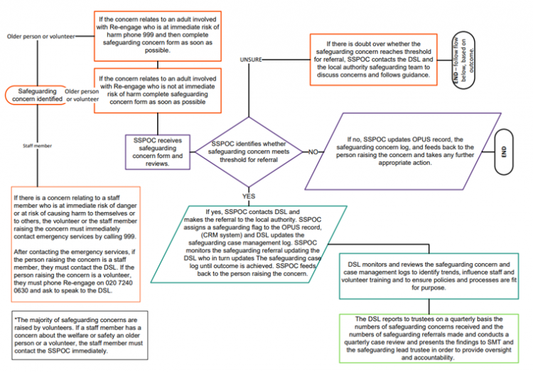 As Re-engage works with older people who are experiencing loneliness it is important that all safeguarding concerns involving older people are treated as ‘adult at risk’ and that this status is reviewed as part of the safeguarding decision-making process.